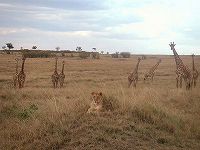 キリンとライオンの珍しい睨みあいに遭遇。案内してくれたポールが写真家だと後で判明したのだが、初日から絶好の撮影場面にデジカメのメモリが減る減る。