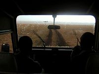 | このロッジも夜中は停電。前のロッジは木の真下にテントがあったので、動物やら昆虫やら色々訪れる。こちらは、そこまでいかないが、虫の鳴き声が特徴的だ。金属音の泣き声。遠くでバブーンの雄叫び。ヌー、そしてライオン。ロッジの回りには電気の通った鉄線。安心とはいえ、ドキドキの夜がくる。双眼鏡をベッド脇に忍ばせ、いざとなったら振り回そう。そうそう真っ暗だから懐中電灯は枕の下。夜中のトイレには困る。 |