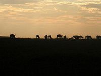| 雨降る草原を抜け、稜線にヌーの大群が移動中。草原を求め、南下中のようだ。まるで影絵。すばらしいい。 |