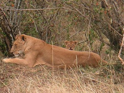 | 子ライオン4匹を発見。ジープにおどろき、どうにか背中に乗る一匹をゲット。警戒心が強いが、こちらがジープの中にいる間はなぜかべつの動物と思うらしい。だから襲ってきたりしない。でも一度車の外に出て、全身を見せた後に、もう一度ジープに乗ると人間として認識するらしい。それもあのときの、あの人間として認識しているらしい。不思議だ。 |