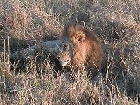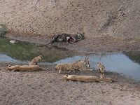 ライオンが仕留めたヌーを食べる瞬間に遭遇。岸のこちら側とあちら側で覗く。途中、別のジープの客が望遠カメラを車の外に落とす。ジープから折りようとするガイドを我らがポールは止めた。無線で説教。アフリカにしてはめずらしい。でもそこはプロ。運転席側のドアを開け、取れるまで、車を三度ほど切り替えす。安心して任せられるガイドである。 |
