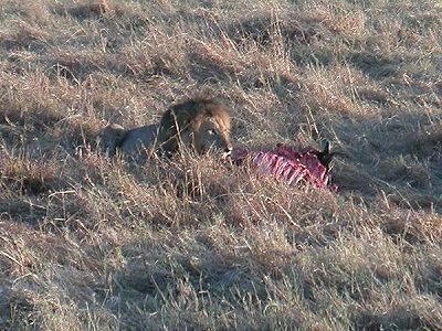 サイを探しに出掛けてまたもライオンに遭遇。寒さのためうまく逃げられなかったのか、ライオンがヌーを食うシーンを多く見かける。ナマ肉を食べる臭いが、ビーフシチューの臭いのようだった。スタッフの一人はオイラが、いきなり昼飯に肉をほおばってたのを見てびっくりしたそうだ。ま、食い意地は人一倍なので失礼。だいたい、ライオンがスペアリブおいしそうに頬張っているのをみて、ナマハム食べたくなったのは私です。