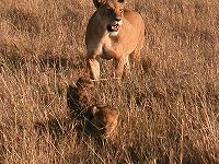 母親ライオンが草原から子ライオンを川縁へ移動させる際に、車の横通る。ややナーバスな模様。小さな声で緊張させないよう留意。でもメス2頭ならば安心だ。前回は飢えた8頭に囲まれたのだから。 |
